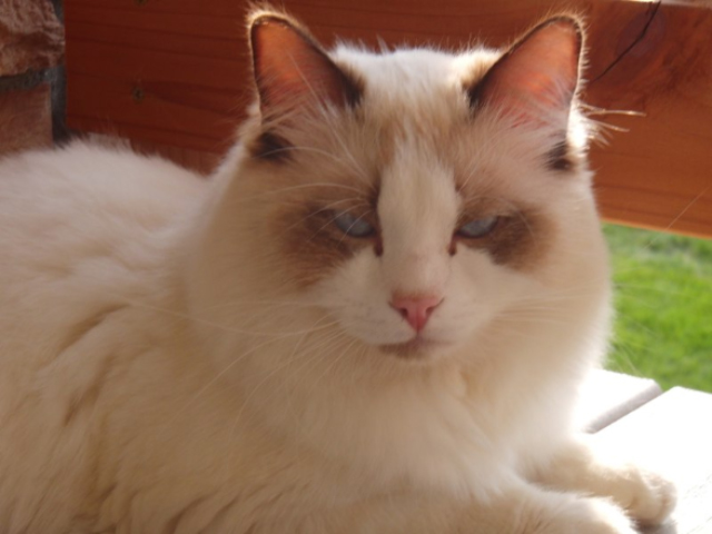 She is the queen and she gets everything and anything her heart desires. In the show ring the judges commented on her “silky coat “and blue eyes. She is a true lilac point that has been genetically tested at Washington State University.